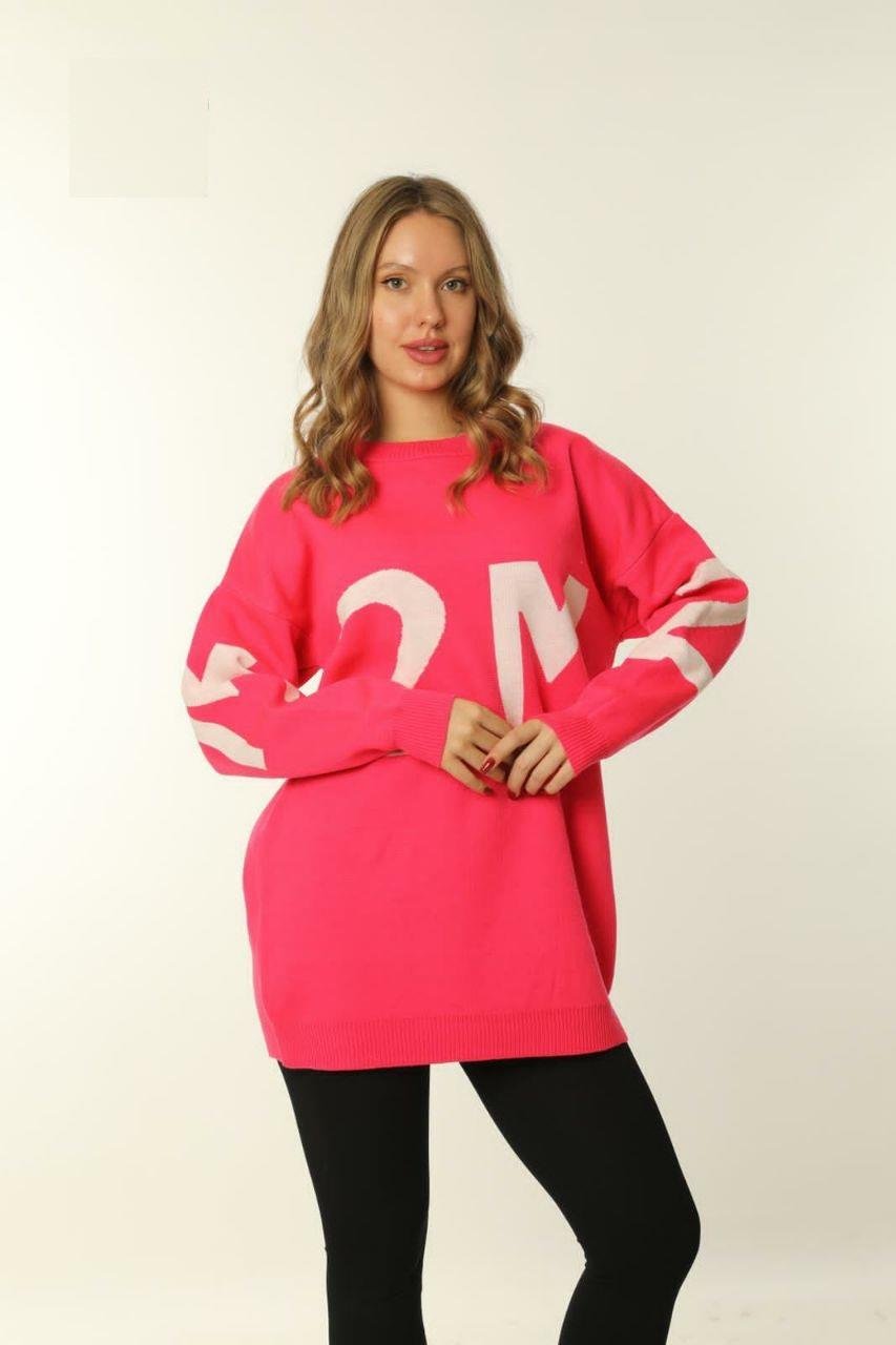 2M Yazılı Dökümlü Salaş Oversize Uzun Triko Kazak