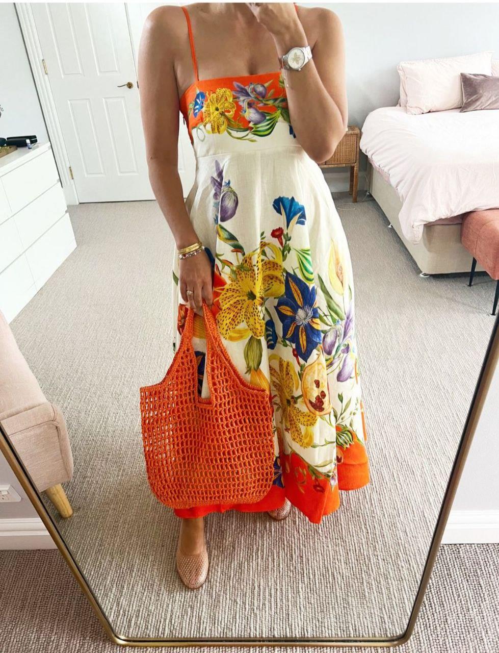 Elbise ince askılı ve kare yakadır. Askıları ayarlanabilir. Sırtında gipe detayı, lastik görevi görüyor. Bu yüzden ekstra fermuarı veya düğmesi bulunmuyor. Ürün çok desenli, içi astarlıdır. Kalıbı normal kalıptadır. Elbise boyu askıları hariç 125cm. Askıların ayarına göre 130cm olabilir. Bu ürünün S M L XL bedenleri üretilmiştir.