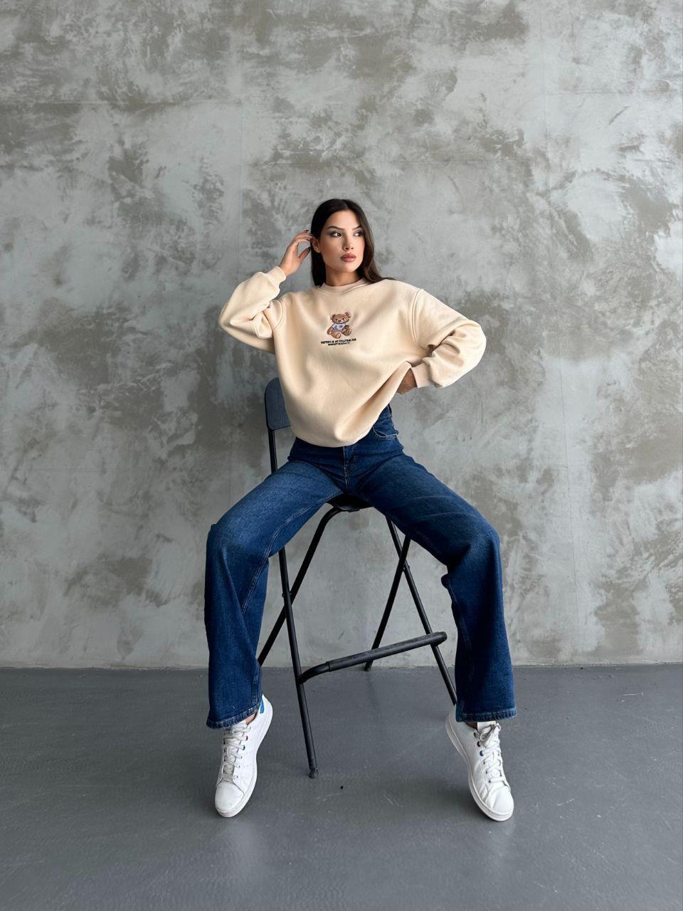 Bisiklet Yaka Ayıcık Nakışlı Oversize Pamuklu Sweatshırt