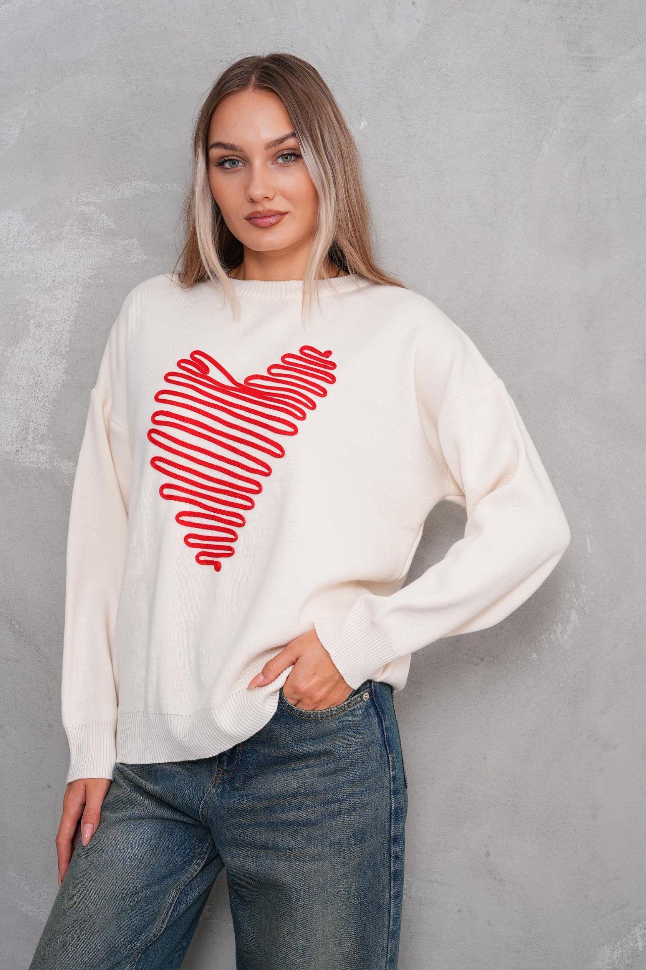 Bisiklet Yaka Kalp Desenli Salaş Triko Kazak