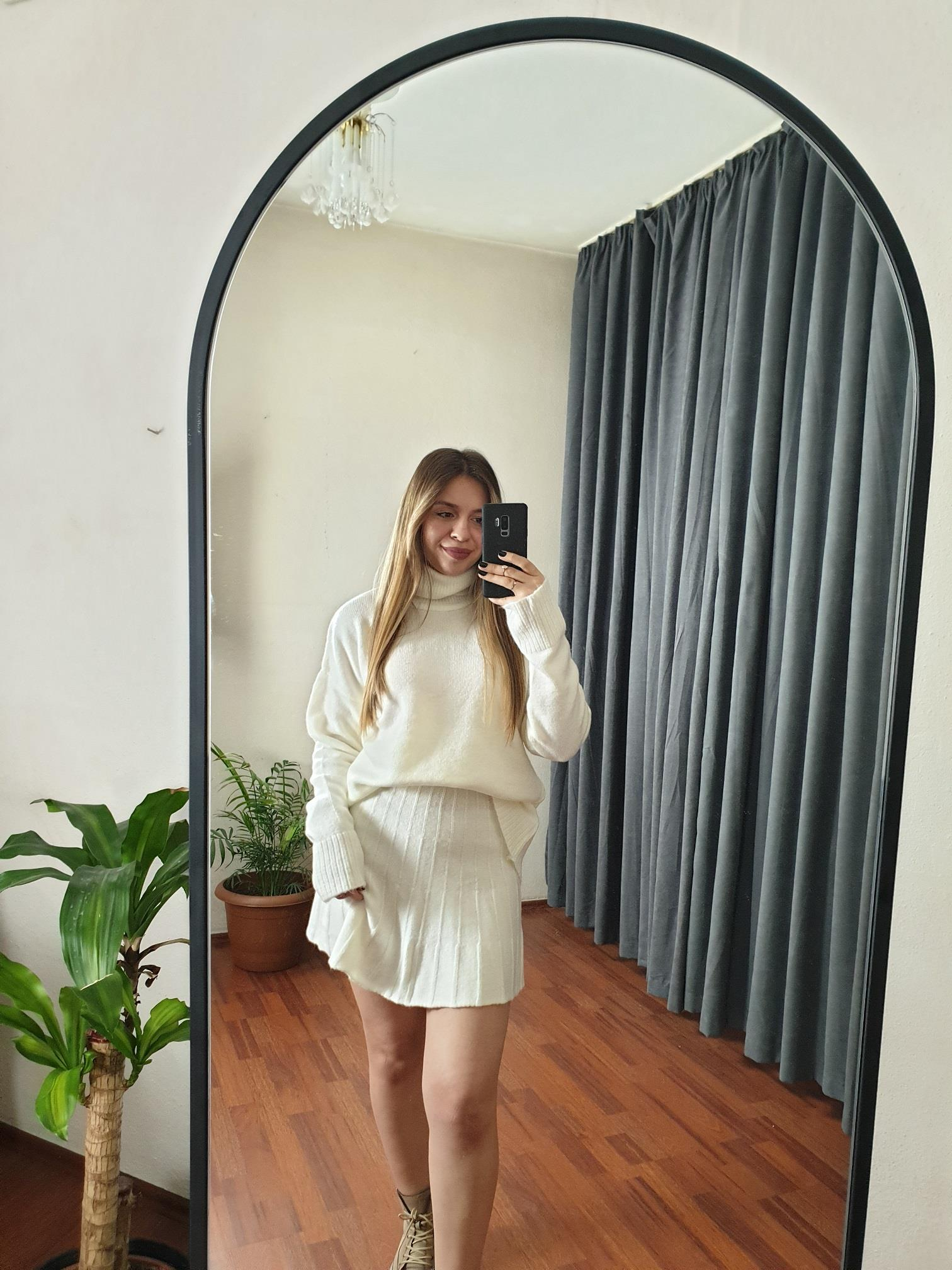Kazak uzun salaş kesimdir. Yakası balıkçı yakadır. Etek pileli çan modelindedir. Takımın kumaşı yumuşak triko takım. Ürün standart beden olarak üretildi. S veya M giyenler için uygundur. L giyenler için kazak çok rahat olur fakat, etek küçük gelebilir. Kazak boyu 65cm en olarak sadece önden ölçülmüş hali 58cm. Eteğin boyu 46cm, bel kısmı dar fakat hafif esneme payı da var.