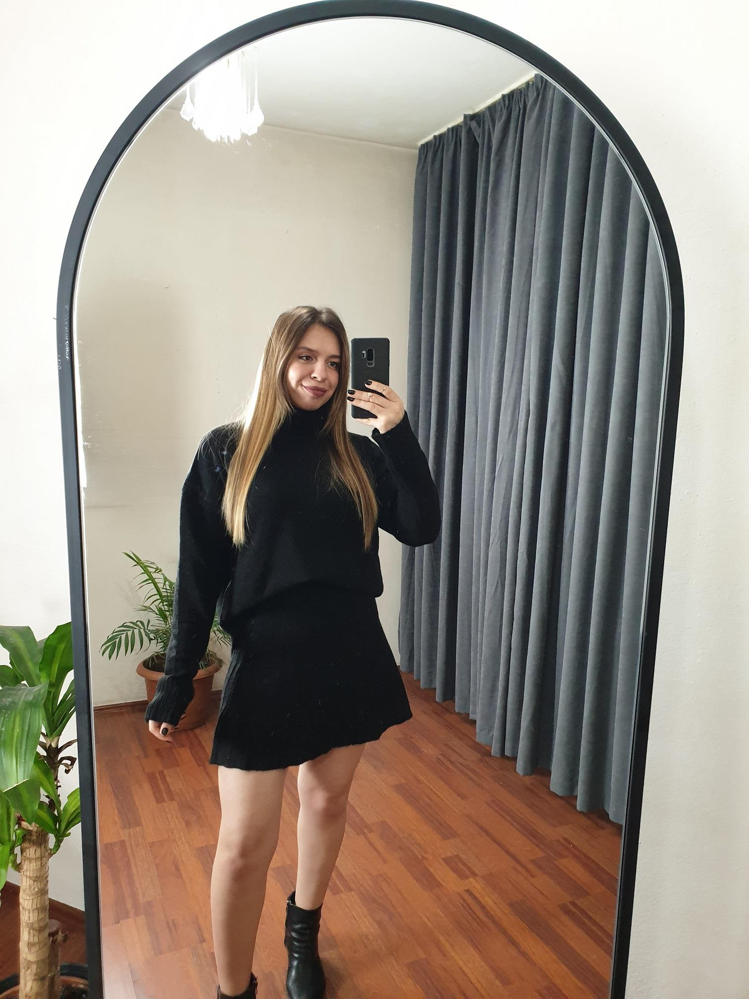 Kazak uzun salaş kesimdir. Yakası balıkçı yakadır. Etek pileli çan modelindedir. Takımın kumaşı yumuşak triko takım. Ürün standart beden olarak üretildi. S veya M giyenler için uygundur. L giyenler için kazak çok rahat olur fakat, etek küçük gelebilir. Kazak boyu 65cm en olarak sadece önden ölçülmüş hali 58cm. Eteğin boyu 46cm, bel kısmı dar fakat hafif esneme payı da var.