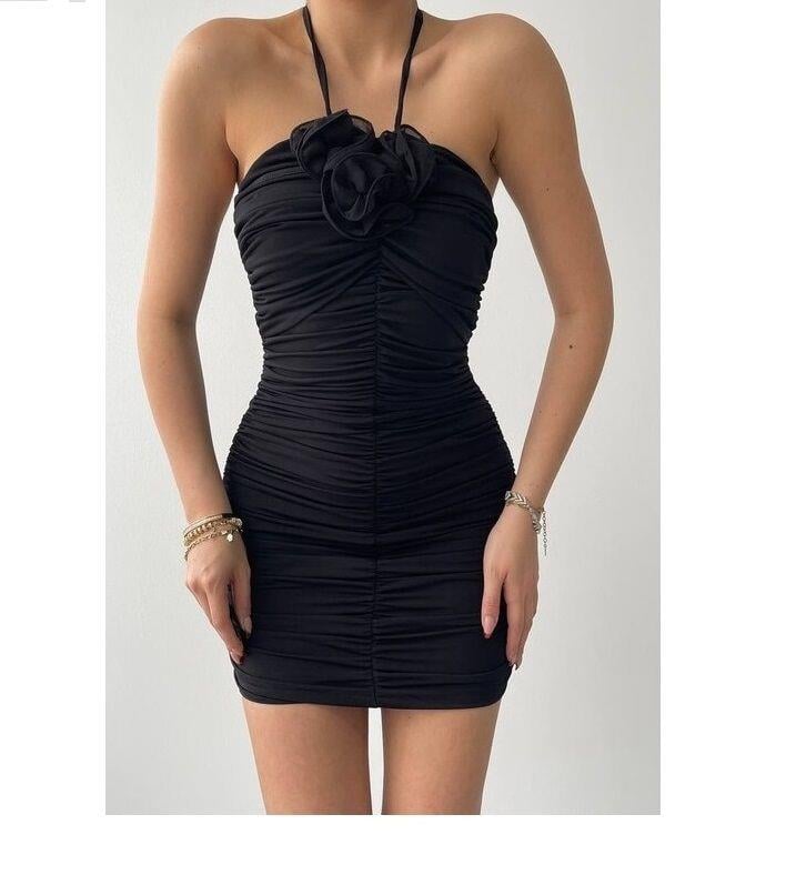 Elbise boyundan ip bağlamalıdır. Göğüs kısmında çiçek detayı var. Elbise komple drapeli büzgülüdür. Kalıbı dar kalıp, Kumaşı orta kalınlıkta esnek sandy kumaş. İçi komple astarlıdır. Sırt kısmında gizli fermuarı bulunuyor. Bu ürünün S M L  bedenleri üretilmiştir. Elbise straplez olduğu için göğüs kısmından eteğe kadarki boyu 65cm