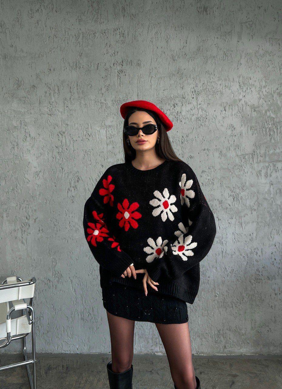 Kazak bisiklet yakadır. Ön ve arka kısmı büyük çiçek desenlidir. Kumaşı çok kalın tok triko kumaş. Ürün standart beden olarak üretilmiştir. S-L arası giyenler için uyumludur. Kişiye göre dökümlü veya normal kalıpta durabilir. Kazan boyu 60cm en olarak sadece önden ölçülmüş hali 70cm.