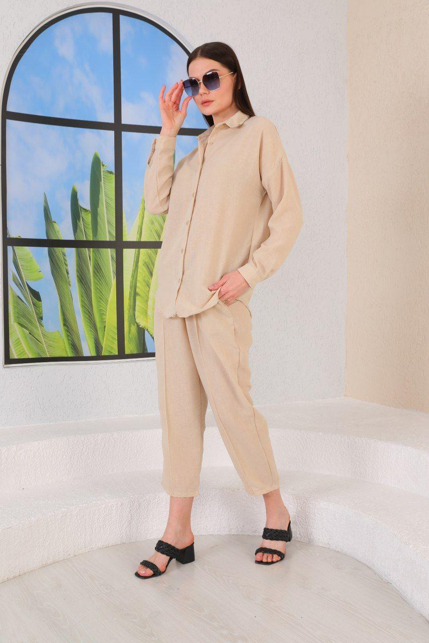 Dar Kesim Pantolon Rahat Kesim Düz Gömlek İkili Keten Takım