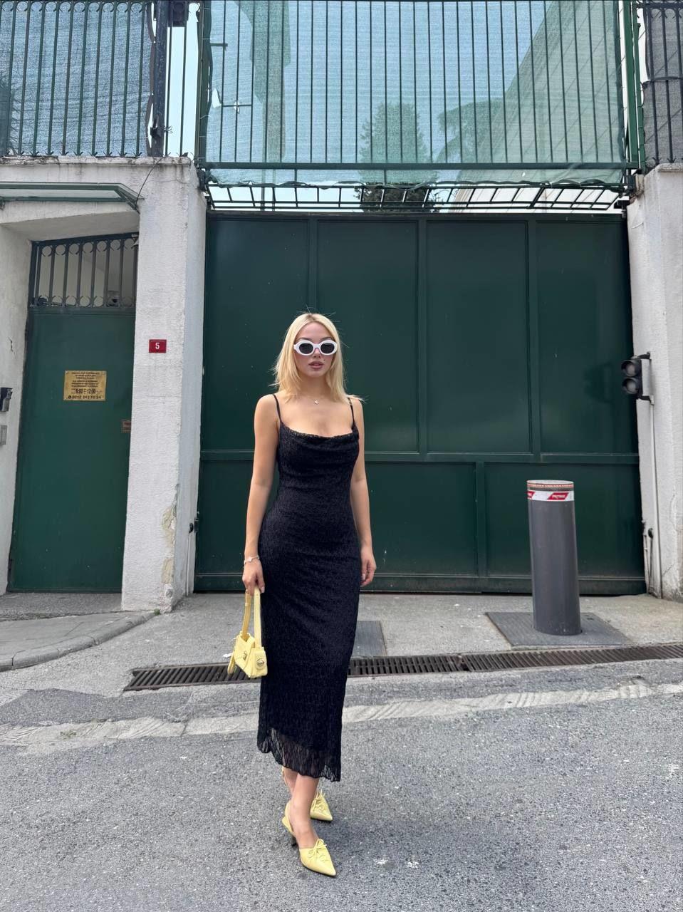 Elbise ayarlanabilir ince askılıdır. Yakası dökümlü degaje yakadır. Kumaşı esnek dantel kumaştır. İçi komple astarlıdır. Bu ürünün XS S M L bedenleri üretilmiştir. Elbise boyu 110cm