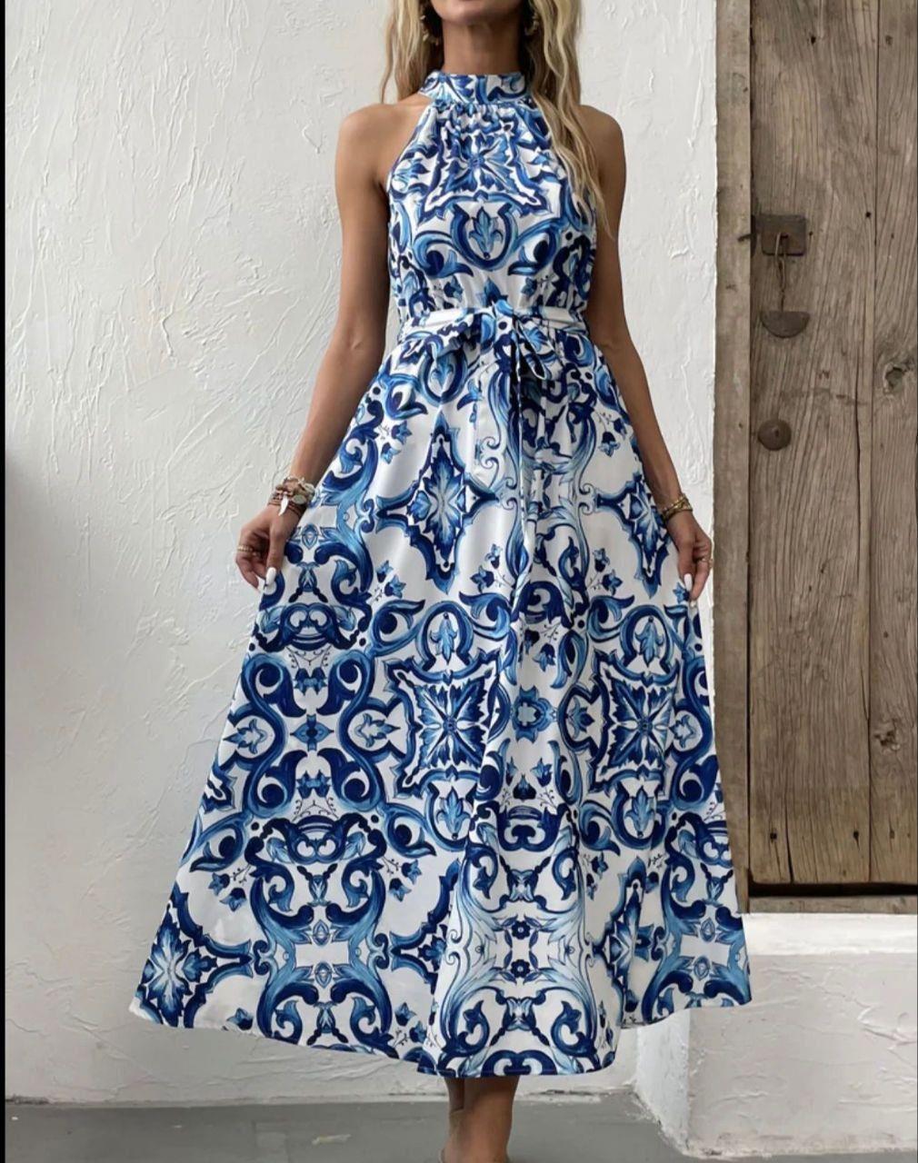 Halter Yaka Etnik Çini Desenli Salaş Maxi Elbise