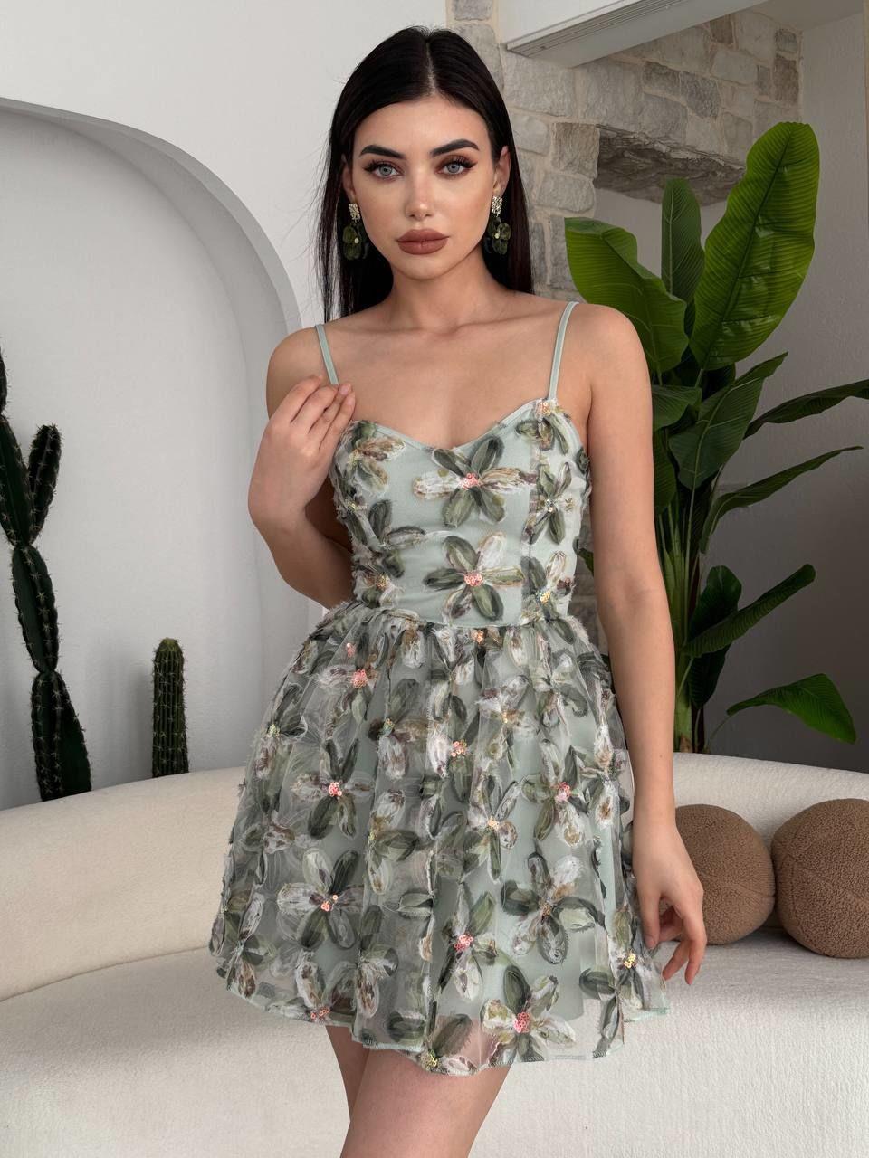Ürün ince ayarlnabilir askılıdır. Kumaşı çiçek işlemeli tül kumaştır. İçi astarlıdır. Sırt kısmı gizli fermuarlıdır. Etek kısmı kloş gelmekte. Bu ürünün S M L bedenleri üretilmiştir. Elbise boyu askıları dahii 80cm