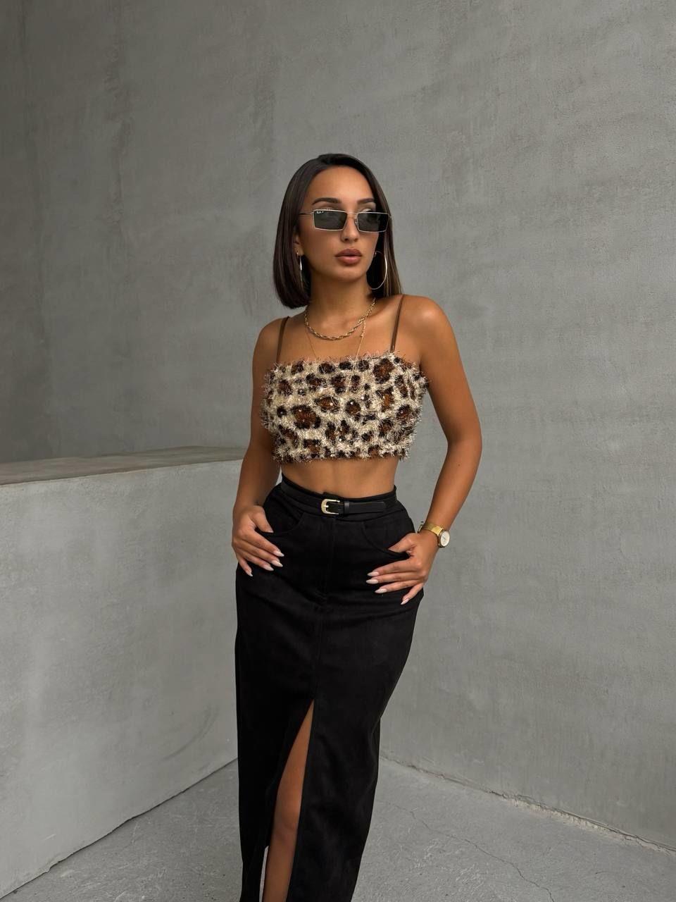 Crop ince ayarlanabilir askılıdır. Deseni leopar desen. Kumaşı esnek sakallı ve payetli kumaş. İçi astarlıdır. Yandan gizli fermuarı var.  Büstiyerin S M L XL bedenleri üretilmiştir. Omuzdan aşağı crop boyu  35cm