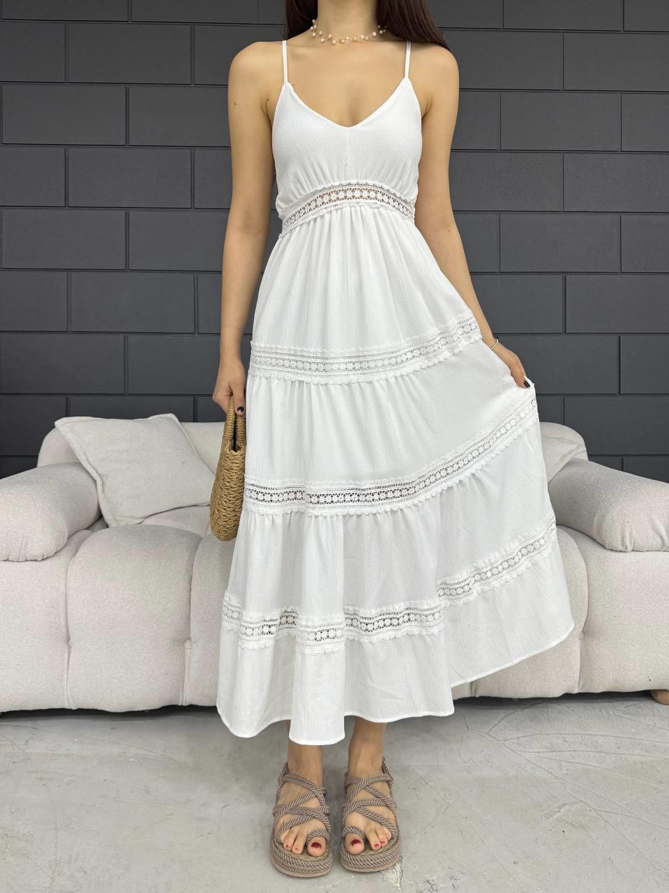 Elbise dantel güpür detaylıdır. İp askıları ayarlanabilir. İçi dize kadar astarlıdır. Bel kısmında gipe lastik olduğu için giyince tam oturur. Göğüs kısmını ip askılardaki ayar kısmından ayarlanabilir. Etek kısmı bol ve rahat gelmekte. Bu ürünün S M L bedenleri üretilmiştir. S bedenin boyu askıları hariç sadece göğüsten aşağısı 103cm.