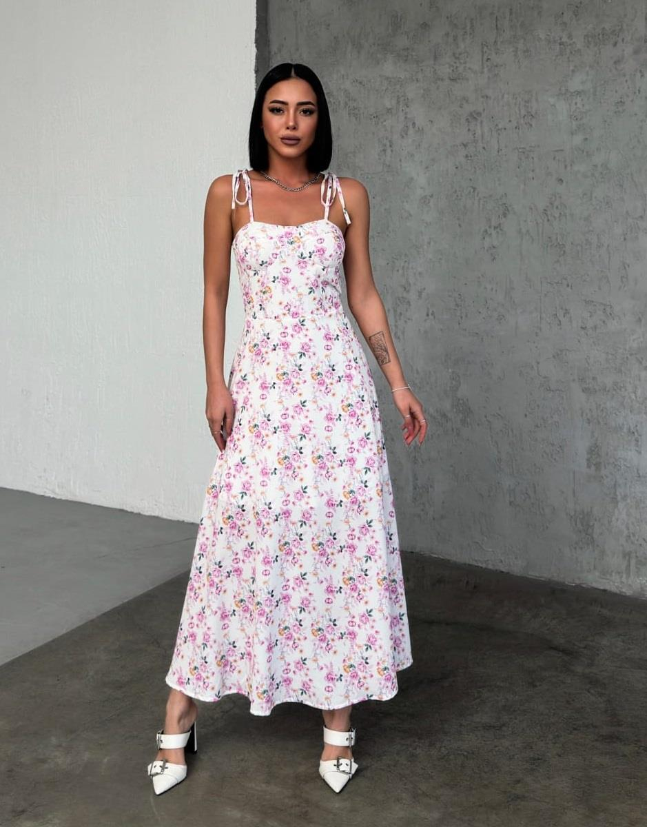 Ürün bağlamalı ip askılıdır. Boyunuza göre iplerden ayar verip bağlayabilirsiniz. Göğüs kısmı destekli glopludur. Arka kısmında gizli fermuarı bulunuyor. Önden yırtmaçlıdır. Kumaşı dijital baskılı krep kumaş. İçi dize kadar astarlıdır. Bu ürünün S M L bedenleri üretilmiştir. Askılar hariç göğüs kısmından eteğe kadarki boyu 120cm en olarak bel kısmının sadece önden ölçülmüş hali 35cm.