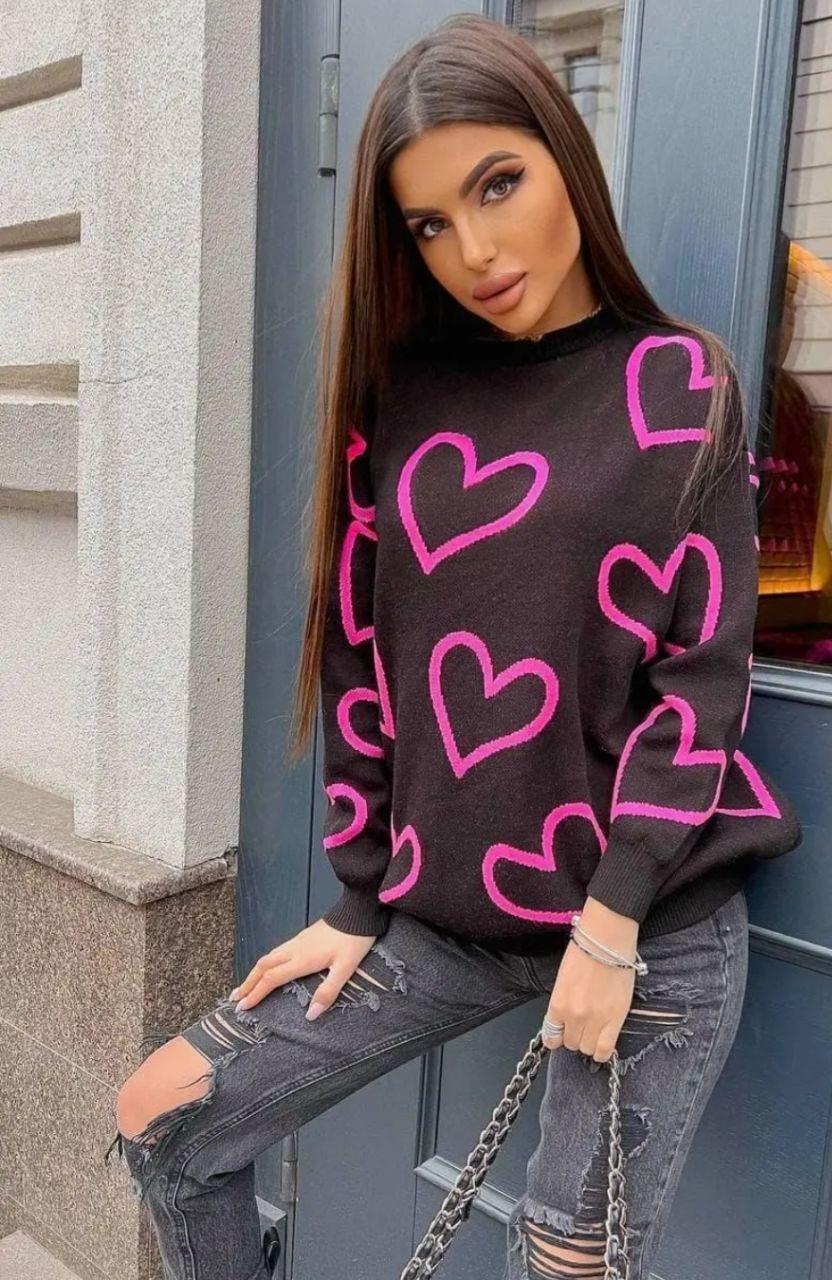 Kalp desenli salaş kazak. Ürün fuşya kalplerle kaplı. Yanlardan etek uçlarından hafif yırtmaçlıdır. Kumaşı triko. Yakası bisiklet yaka. Ürün orta kalınlıkta. Ürün bol kesim standart olarak üretildi. Bu yüzden S-Xl arası uyumludur. Kazak boyu 77cm en olarak genişlik 55cm.