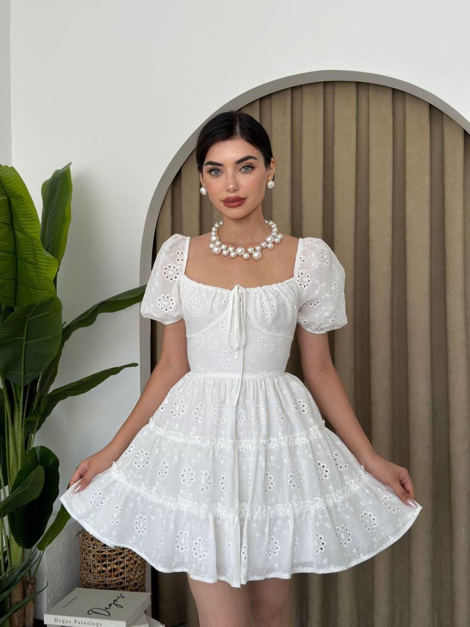 Ürün kalp yaka göğüs kısmı gloplu desteklidir. Omuzlardan ve bilek kısmından lastiklidir. Etek kısmı kat kayt kloş gelmekte. Göğüs kısmından mini korse fiyonk detaylıdır. Sırt kısmında gizli fermuarı mevcut. Kumaşı fisto güpür kumaştır. İçi komple astarlıdır. Bu ürünün S M L bedenleri üretilmiştir. Elbise boyu 70cm