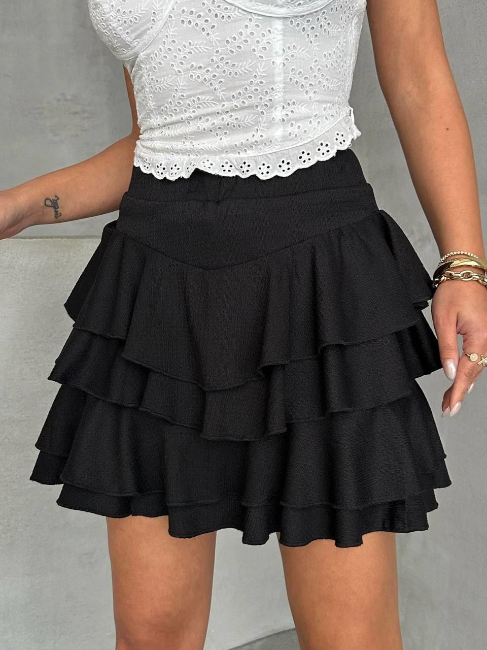 Etek mini ve kat kat gelmektedir. İçi şortludur. Beli lastikli olduğu iin ekstra kapaması bulunmuyor. Kumaşı bürümcük kumaş olduğu için ütü gerektirmez. Bu ürünün S M L bedenleri üretilmiştir. Etek boyu 35cm