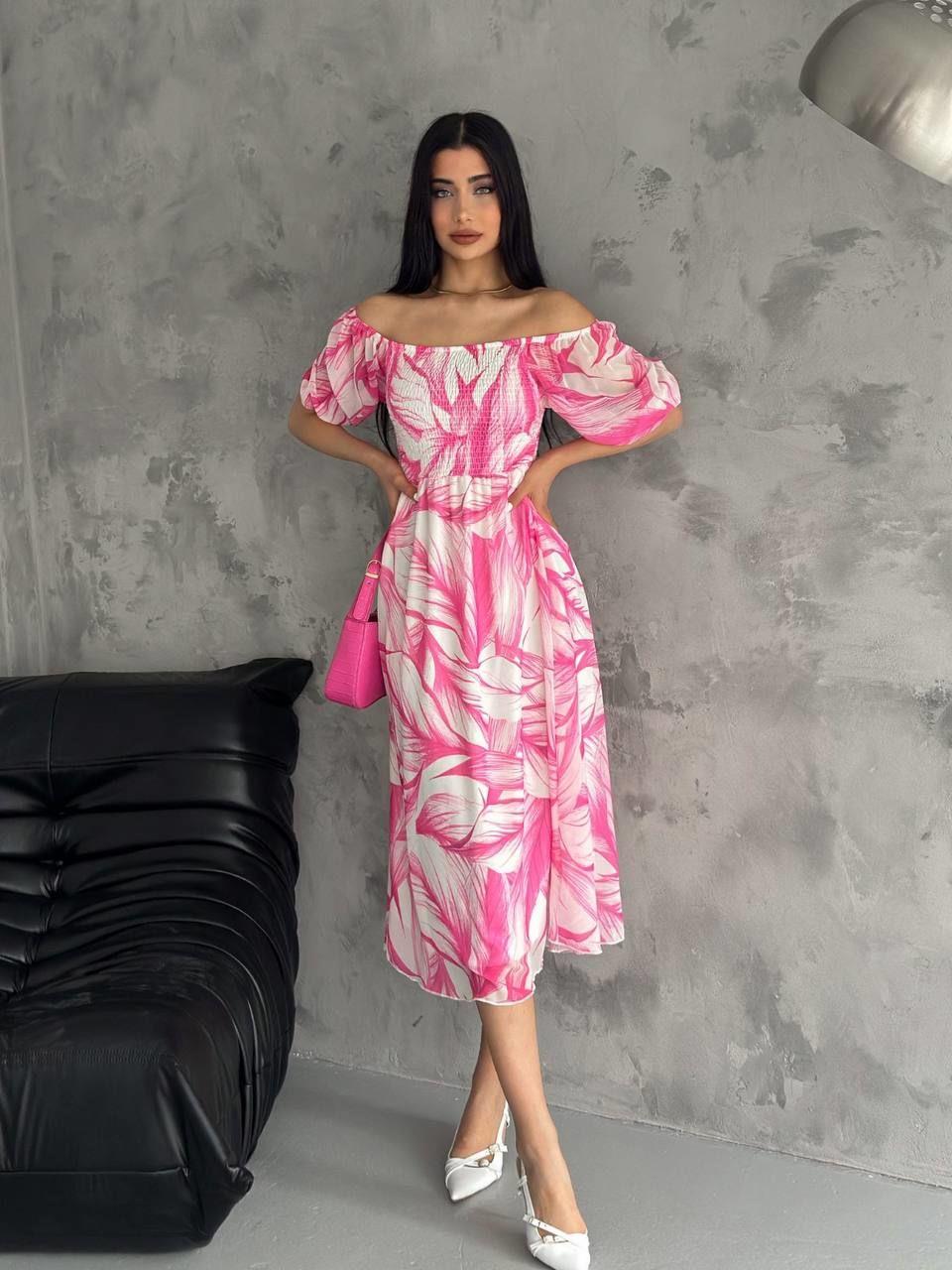 Elbise madonna yakalıdır. Omuzlardan lastiklidir, kişinin isteğine göre omuzları açık kullanılabilir. Göğüs kısmı büzgü gipelidir. Kolları kısa kol lastikli. Kumaşı yaprak desenli şifon. İçi komple astarlıdır. Ürünün boyu dizaltı midiboy. Bu ürünün S M L bedenleri üretilmiştir. Elbise boyu omuzlar dahil 115cm, en olarak sadece önden ölçülmüş hali 27cm fakat 45cm kadar esniyor