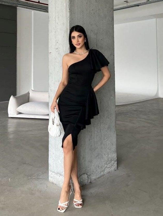 Omuz Ve Eteği Fırfırlı Dizde Tek Omuz Elbise Siyah
