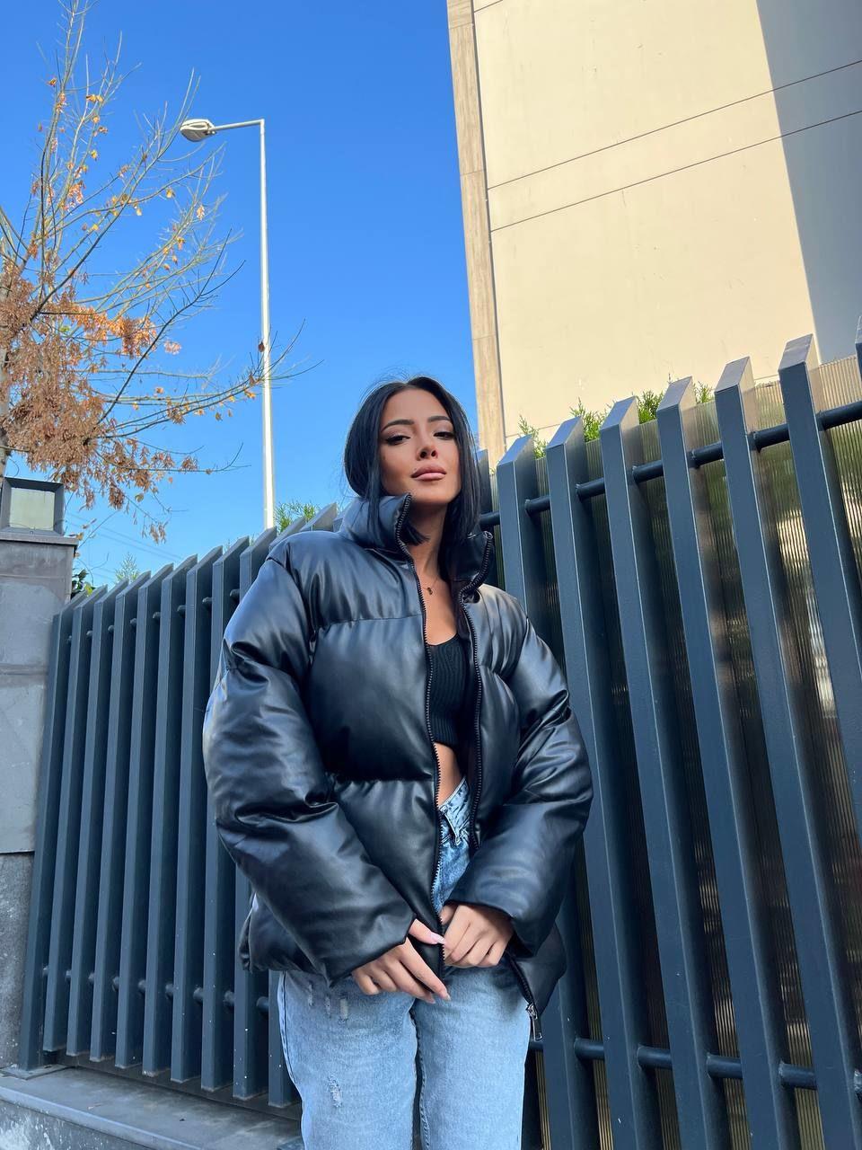Deri şişme mont. Ürünün kalıbı oversize geniş kalıptır. Kalınlık derecesi kalın. Montun dışı deri içi full astarlıdır. Önden çift ceplidir. Yakası dik yaka, kalıbı rahat kalıptır. Önden fermuar kapamalı. Bu ürünün S M L bedenleri üretilmiştir. Montun boyu 65cm en olarak S bedenin iki kol arası 52cm.