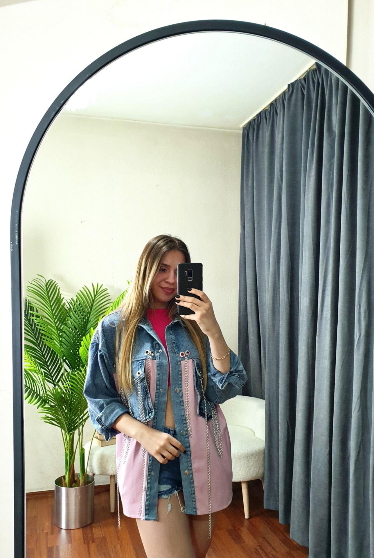 Oversize Salaş Kuş Gözü Zincirli Renkli Jean Ceket