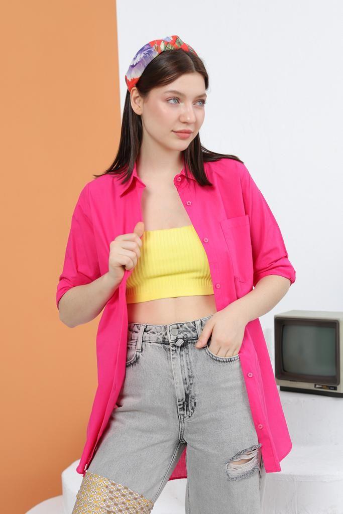 Tek cepli gömlek. Ürün gömlek yaka ve uzun koldur. Bilek kısmından düğmelidir. Önden düğmelidir. Fuşya rengi hariç diğer tüm renkleri sadece önden düğmelidir. Fuşya rengi sırt kısmından komple düğmeldiir. Kumaşı %100 pamuk, kalıbı normal kesim alt kısmı oval gelmektedir. Bu ürünün S M L bedenleri üretilmiştir. Gömlek boyu 72cm S bedenin iki kol arası sadece önden ölçülmüş hali 50cm.