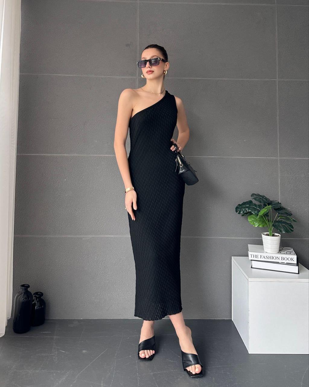 Elbise tek omuz olarak üretildi. Boyu uzun maxi boyda. Kumaşı kendinden desenli ince esnek triko. İçinde astar bulunmuyor fakat örgüleri sık olduğu için iç belli etme durumu çok düşük. Ürün L giyenler için de olur fakat giyince vucudu sarıcağı için fazla kiloların belli olma ihtimalı var. Elbisenin tam boyu 127cm
