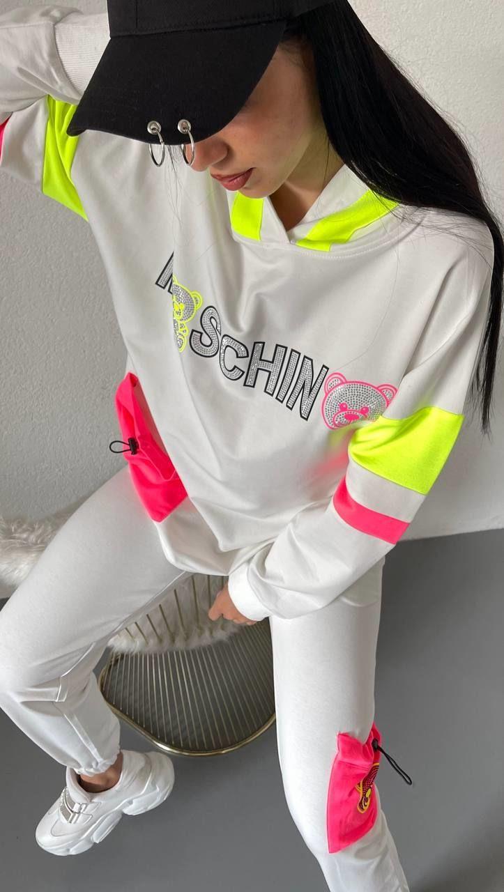 Takım kapüşonlu ve önden taş işlemelidir. Renkli çizgi detayları mevcut. Sağ alt kısmında lastikli cep bulunuyor. Bilek kısmından lastiklidir. Alt eşofman belden ve bilek kısmından lastiklidir. Yanlardan çift ceplidir. Aynı zamanda arka kısmında ve kargo cebi de bulunuyor. Kumaşı ipi iplik içi pamuksuzdur. Bu ürünün S M L XL XXL bedenleri üretilmiştir. 180cm 90 kilo olan bir erkek vucuduna XXL tam gelmektedir.